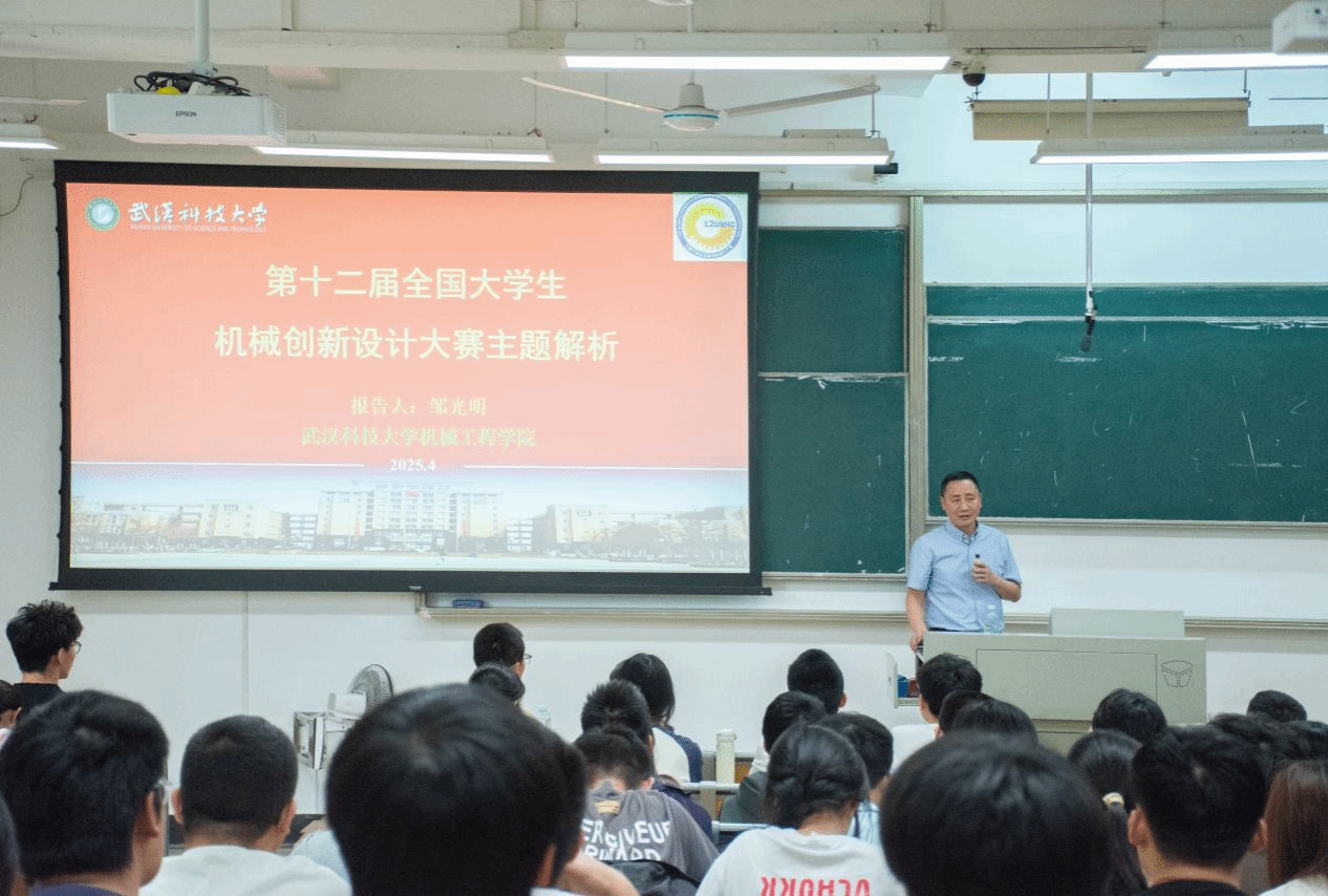 邹光明从大赛特色与作用、历届赛事情况、本届大赛的主体与内容、机械系统总体方案设计等方面为学生们解读了比赛主题与要求,同时为学生们参加比赛做了专业指导。他结合赛事通知分析了参赛作品的主题要求,并结合虾仁剥壳机械的设计等示例为学生们的作品设计提供了指导帮助。他表示,学生们要敢于想象,善于发散思维,大胆的进行作品构思与创新。他指出,作品设计时应有全局观念,由于大赛规则对于作品大小的限制,比赛作品可不必固执于完全实现全部工序板块,而应突出优势板块,进行创新设计。