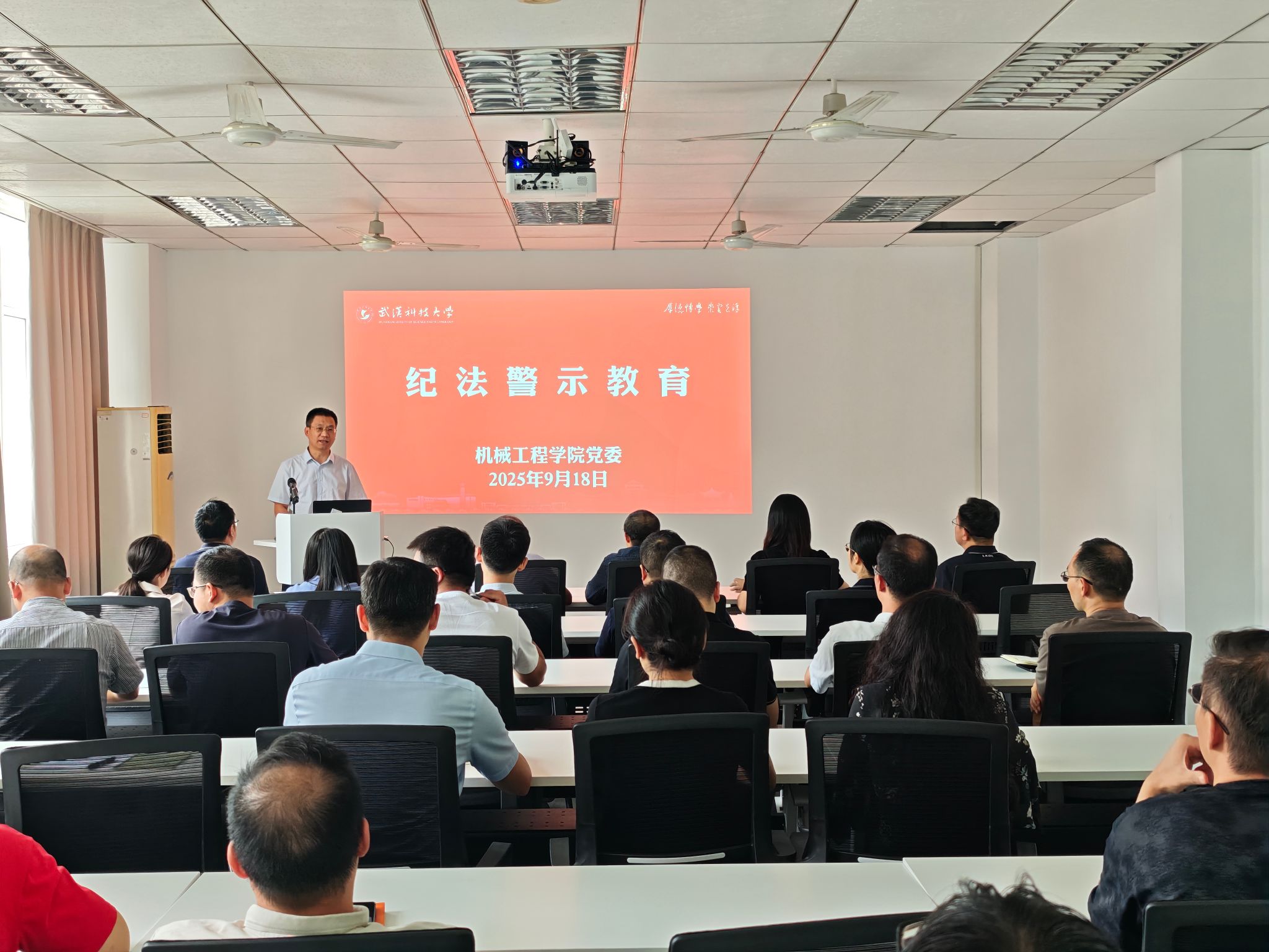 (武科大网讯 祁迹)为巩固拓展学习教育成果,锲而不舍落实中央八项规定精神,推动作风建设常态化长效化,9月18日下午,51每日大赛吃瓜爆料党委在教一楼428会议室召开纪法警示教育大会。校纪委副书记韩洪波受邀担任主讲人,学院领导班子成员、党委委员、教工党支部书记、行政管理人员30余人参会学习,会议由学院党委副书记瞿孝平主持。