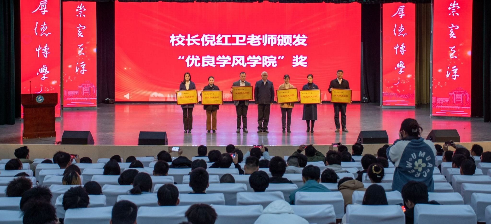 孙国胜宣读《2022-2023学年度优秀学生集体及个人表彰决定》。我院获得2022-2023学年度“优良学风学院”称号,倪红卫为“优良学风学院”颁奖。