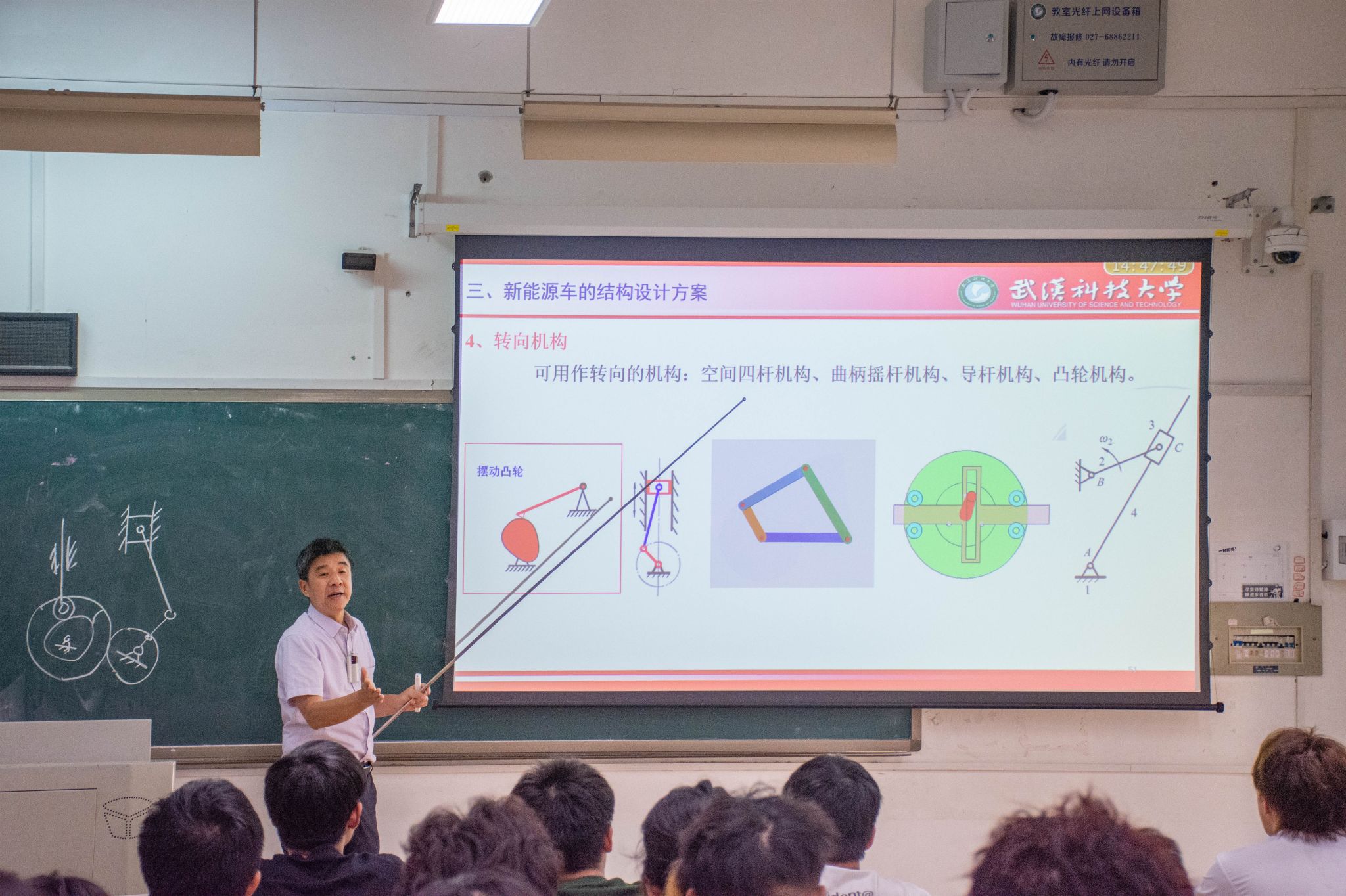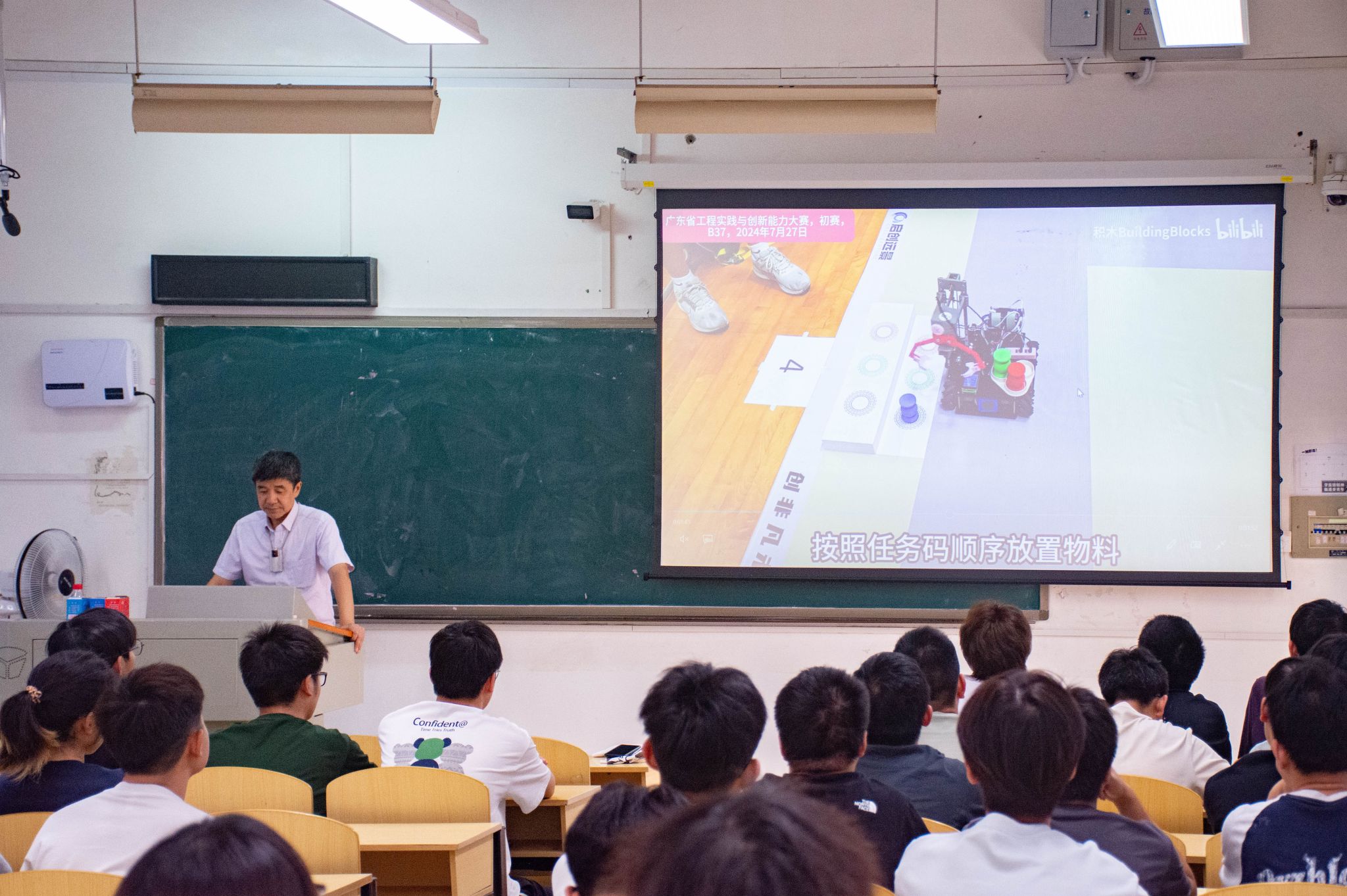 为使在场学生对竞赛有更深的了解,汤勃老师以往年赛事为例,为全体学生讲解了“以重力势能驱动的具有方向控制功能的自行小车”。他强调:“这个项目不仅考验了参赛者对物理学原理的深刻理解和应用能力,还极大地锻炼了他们的创新思维、动手实践能力和团队协作精神。”