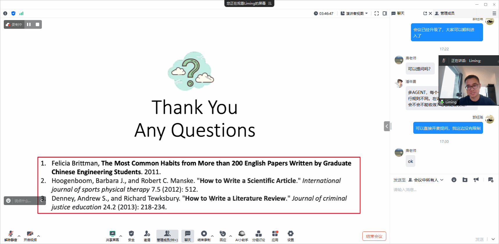 报告结束后,生们皆由衷感慨徐黎明博士,为他们学术研究的道路上提供了极具价值的思路与方法。本次报告会为师生们呈现了一场干货满满、精彩纷呈的学术活动。参会师生的积极交流表达出了对这项专题活动的浓厚兴趣,也为自身的发展留下了宝贵的经验