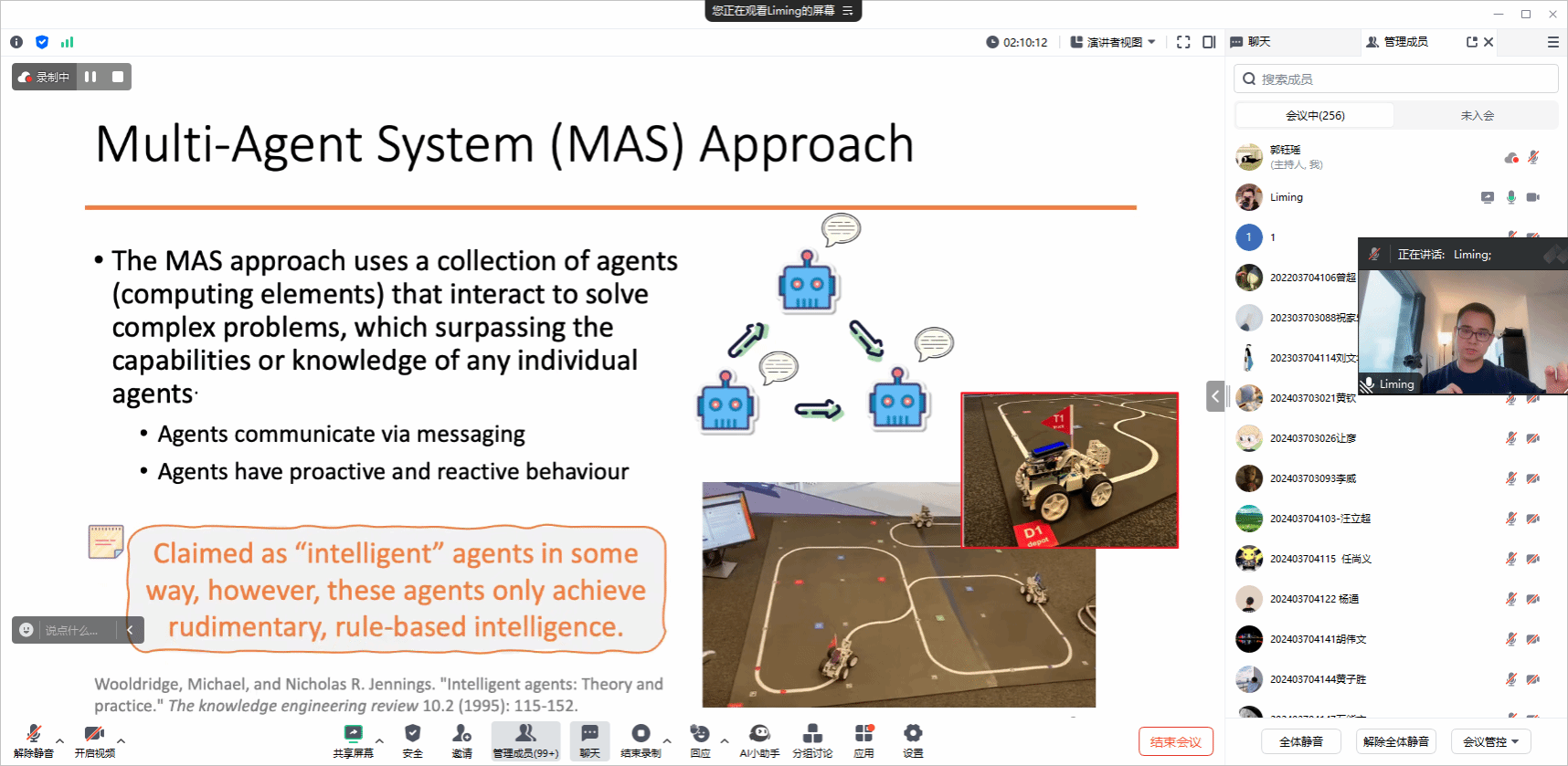 接着,就“自主供应链的专题进行了线上提问交流环节,各研究生针对大语言模型在涉及大量不同实体情况下系统是否会收敛或是否需要加入一些边界或协议使系统收敛;以及如何设计不同的规则及提示词,让智能体自适应自学习决策等问题,积极踊跃地发表看法与徐黎明博士深入探讨。