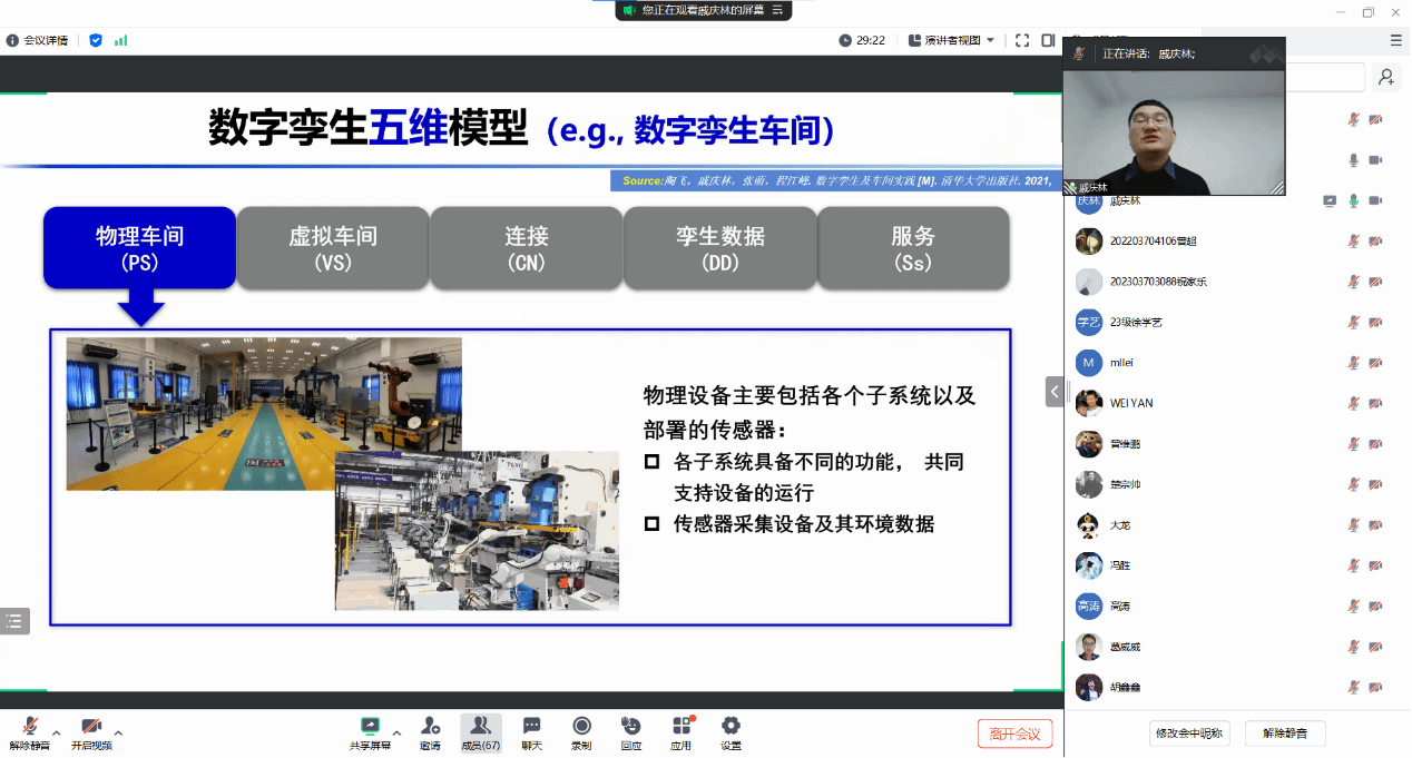 接着,戚教授详细讲解了数字孪生的相关概念,如物理孪生、虚拟孪生等,并通过实例展示了不同场景下数字孪生的应用。戚教授还介绍了数字孪生的五维模型,以数字孪生车间为例,深入阐述了物理车间、虚拟车间、连接孪生数据和服务之间的关系,并展示了物理车间的实际场景图。